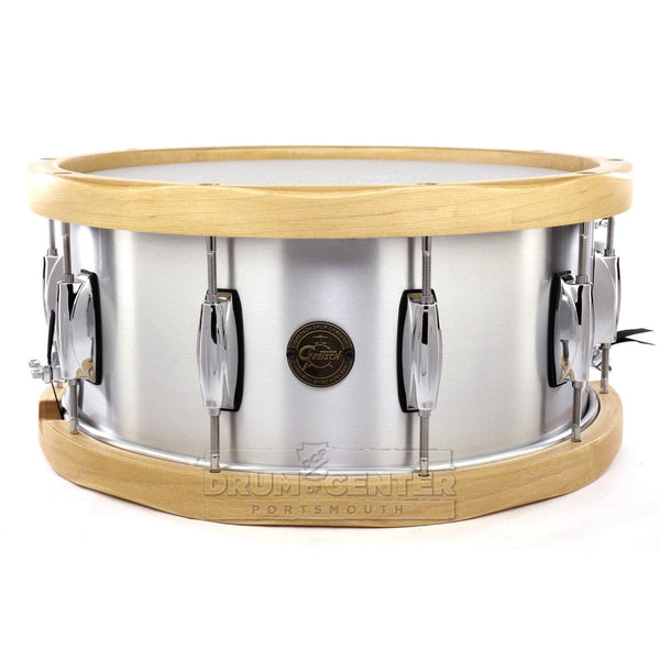 Gretsch's 6.5x14 Aluminum Snare Drum with Wood Hoops begins with our 1.2mm seamless aluminum shell. This shell creates a drier tone due to the inherent qualities of aluminum along with a focused attack with minimal overtones. Add the 13-ply Rock Maple hoops and you get extra warmth added to the attack along with a massive cross stick sound. The wood hoops are also low profile to enhance playing comfort and feature beveled edges to provide a unique look. Sonically, these hoops produce an earthy, warm timbre with explosive cross-stick clicks – truly a unique addition to any snare collection. 1.2 mm Seamless Aluminum 30 Degree Bearing Edge 13-ply Rock Maple Hoops 10 Lugs Drum heads by Remo The wood hoops add extra warmth to the attack, enhance playing comfort, and provide a unique look. Not only do they produce an earthy, warm timbre, but they also create a massive cross stick sound and explosive cross-stick clicks, making this snare a unique and valuable addition to any drummer's collection.