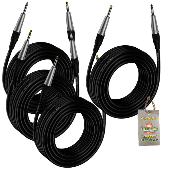 These deluxe 20-foot straight end 0.25 (1/4) inch (6.35 mm) shielded instrument and speaker cords have braided copper shielding for maximum electrostatic hum reduction. The heavy-duty heat shrunk tubing covers the entire cable to reduce extraneous noise interference and to relieve strain on the cable. All of these cables have oxygen free copper wire to reduce resistance and the metal plugs are gold tipped for ultimate durability and better connections than usual silver tipped connections. These instrument cables incorporate super low signal resistance providing a powerful, clean signal; all of the qualities of these instrument guitar cables come together to form an incredibly quiet and reliable cable. You will receive 4 of these awesome 0.25 (1/4) inch (6.35 mm) straight instrument cables. These guitar instrument cables are perfect for guitar to amp cord, bass guitar amps, or a general patch cord.