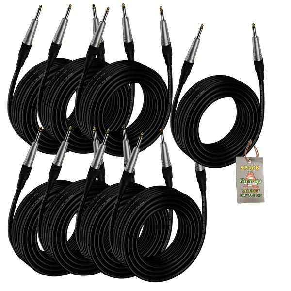 These deluxe 20-foot straight end 0.25 (1/4) inch (6.35 mm) shielded instrument and speaker cords have braided copper shielding for maximum electrostatic hum reduction. The heavy-duty heat shrunk tubing covers the entire cable to reduce extraneous noise interference and to relieve strain on the cable. All of these cables have oxygen free copper wire to reduce resistance and the metal plugs are gold tipped for ultimate durability and better connections than usual silver tipped connections. These instrument cables incorporate super low signal resistance providing a powerful, clean signal; all of the qualities of these instrument guitar cables come together to form an incredibly quiet and reliable cable. You will receive 8 of these awesome 0.25 (1/4) inch (6.35 mm) straight instrument cables. These guitar instrument cables are perfect for guitar to amp cord, bass guitar amps, or a general patch cord.