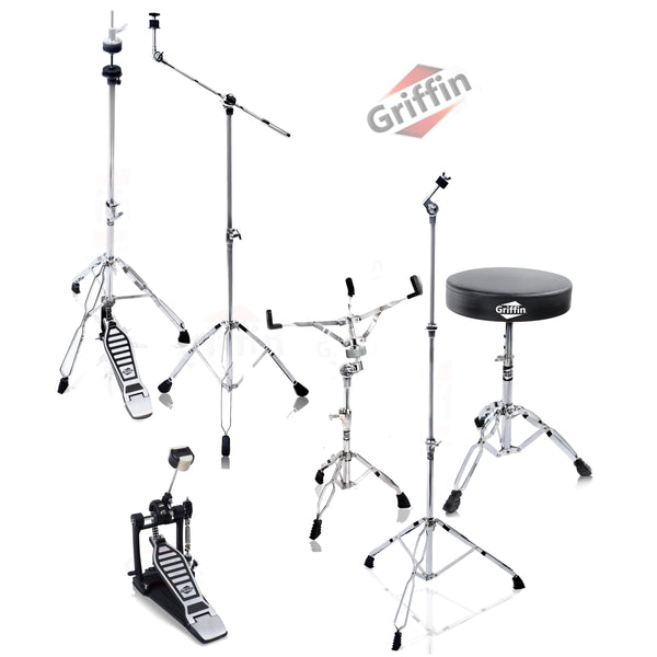 Read MoreSturdy and durable, this premium quality Griffin snare drum stand promises outstanding durability that will handle daily abuse without falling apart on you. Griffin's full-size six (6) piece drum hardware set comes with the following: (1) Snare Drum Stand model# S80 | (1) Hi-Hat Cymbal Stand model# H80 | (1) Single Kick Drum Pedal model# P200 | (1) Straight Cymbal Stand model# C80 | (1) Cymbal Boom Stand model# B80 | (1) Drum Throne Stool model# T100. |