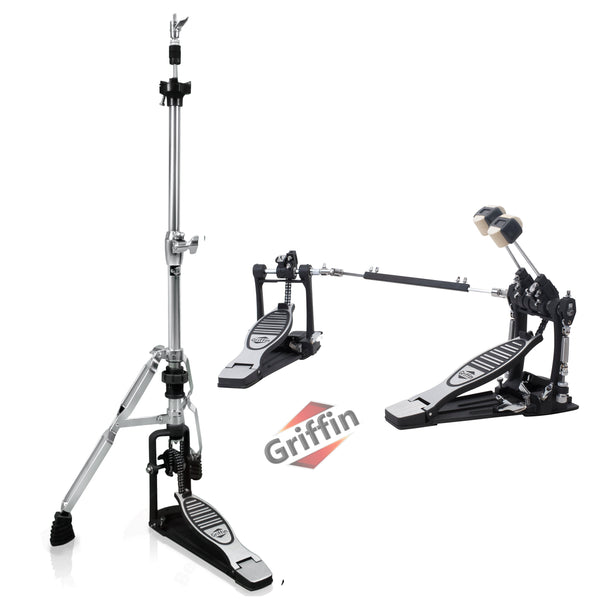 2 Pack Delux Duo Drum Hardware Set! Experience precision and versatility with the Griffin 2 Leg Hi-Hat Stand and Double Bass Drum Pedal package, expertly crafted for drummers seeking advanced control and space efficiency in their setup. This combination features a two-leg hi-hat stand designed to fit seamlessly in setups with multiple pedals, optimizing space without compromising performance. Its professional-grade tension adjustment system allows for customized pedal responses, catering to diverse playing styles from tight control for rapid sequences to a looser feel for heavier beats. The double bass drum pedal is a standout for its smooth, double-chain drive mechanism, ensuring reliable and responsive operation. Drummers can adjust beater angles, pedal tension, and footboard height to suit personal preferences, enhancing playability and comfort. Constructed from durable, high-grade steel, these components are built to withstand rigorous use, making them ideal for both studio recordings and live performances. The hi-hat stand's rotating legs offer flexibility in pedal arrangement, while the double bass pedals include a built-in drum key holder for quick adjustments during gigs. Each piece is finished with a corrosion-resistant coating, combining aesthetics with longevity. The Griffin 2 Leg Hi-Hat Stand and Double Bass Drum Pedal package is not just a set of hardware; it's a transformational tool that empowers drummers to reach new heights in their musical journey. It's perfect for drummers who are serious about their craft and demand the best in terms of functionality, reliability, and performance. With this package, drummers can expect a seamless integration into any drum kit, providing a solid foundation for both practice and performance, and enabling drummers to express their musical vision without compromise.