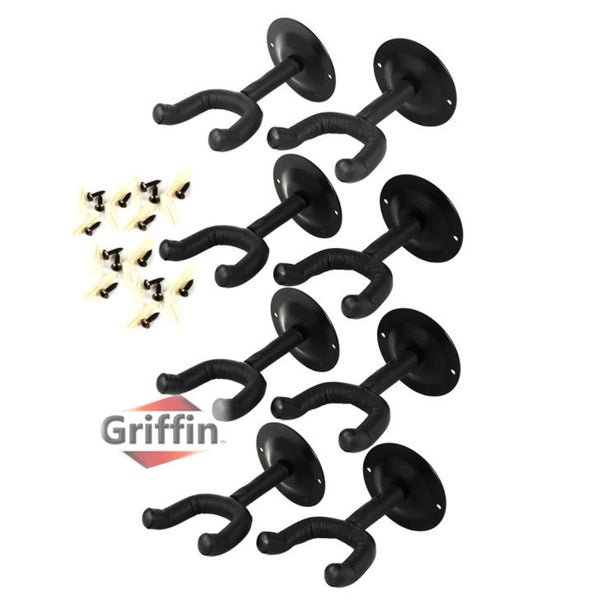 KEEP YOUR GUITARS OFF THE FLOOR:Store and display your guitars in style with the best, wall mount guitar neck holders by Griffin! Whether for the practicing student, professional performer or music store, these premium guitar hangers are suitable for any guitar (electric, acoustic, bass) or even violin, mandolin, and banjo. Available in a convenient set of 8 hooks, it is a must have for any musician. |