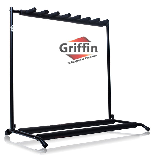 Ideal for any guitarist, the Griffin Portable 7 Guitar Stand supports all types of guitars including acoustics, electrics, and bass guitars. The user will know their guitars are safe because the Griffin Portable 7 Guitar Stand is very strong, sturdy, and roadworthy. Made to exacting specifications with tubular steel and padded with neoprene rubber, this folding guitar stand can safely hold from 1 to 7 guitars without scratching the finish or leaving scuff marks on your instruments! GIG READY, the Griffin Portable 7 Guitar Stand folds up quickly for easy transport so youll always have a safe place for your guitar. GRIFFIN…a brand you can trust.
