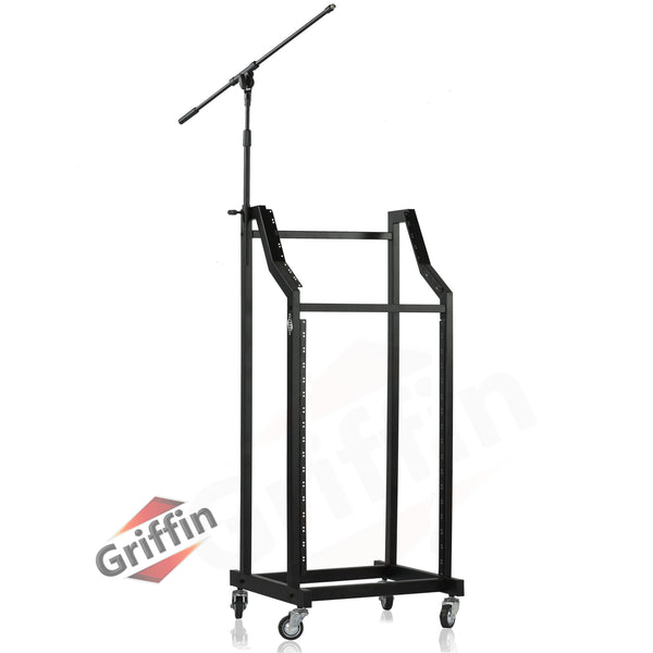 This 25U space studio equipment rackmount stand with casters is perfect for todays modern musician. While the all-steel construction is sturdy and durable on this DJ rack cart, it is also versatile with a top audio mixer platform mount that will easily hold most standard 19 rackmount mixers. The built-in boom microphone mount eliminates the need for an extra microphone stand. Who doesnt want to streamline their rackmount case gear? Twenty-five (25) total rackmount spaces, a built-in microphone boom and the unique compact design make this rackmount stand a must have for any serious or novice sound engineer needing to organize themselves and get rid of clutter.