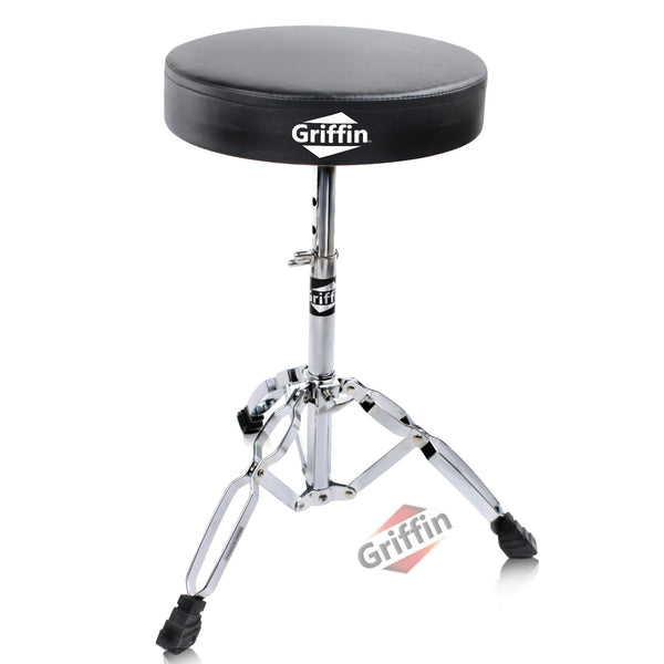 This sturdy padded drummer throne seat comes with a comfortable padded seat measuring 12 inches in diameter and chrome plated, double-braced legs that can easily support any drummer weighing up to 215 pounds. The padded drum seat stool features a thick 2.75-inch padded seat, and an adjustable height from 18 inches to 23 inches high so you can find your personalized height. Once you find that height, you can relax and concentrate on your beats knowing that the slip-proof nut and bolt will stay in place as you bang out a concert worthy drum solo. The Griffin T100 drum chair can be used additionally for a guitar seat, dj stool or a general-purpose music stool. This padded drum throne is just one more reason why drummers trust Griffin for all their drum hardware needs.