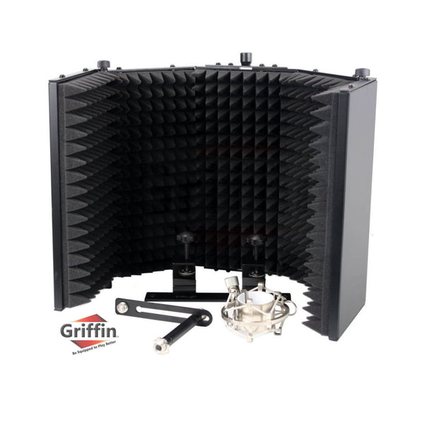 Unlike most recording studio sound absorbers which are made of plastic, only have three panels and are much smaller with thinner sound absorbing panels, Griffin's recording studio microphone diffuser panel is built for the pros with five all metal adjustable sound proof foam panels covered with 2 in of high-density sound absorbing foam. The sharp acoustic panels destroy outside noise distractions as you use this recording studio microphone sound panel. The shock mount depth can be adjusted towards or away from the soundproofing foam to achieve the noise reducing from the sound proof dividers. The recording studio microphone diffuser panels mounting system accommodates tube sizes 15 mm (0.6 in) to 35 mm (1.375 in). It is recommended using a tripod speaker stand or any other vertical post that is 15 mm to 35 mm in diameter for mounting. Accommodates most diaphragm condenser microphones ranging from 46 mm to 54 mm in diameter and weighing up to 4 lbs. This studio shock mount also features a standard-sized die-cast steel adapter with 3/4 inch twenty-seven (27) threads. Acoustic diffuser soundproof panels go perfect with any microphone for podcast recording, sound proof room, dj booth, or home studio recording package.