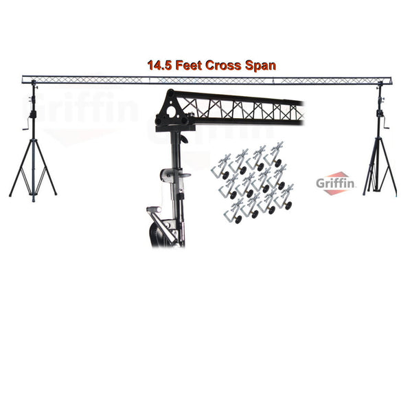 The Griffin Triangle Crank Up Truss Stand Lighting System is exceptionally ideal for the busy roving lifestyle of a mobile DJ and/or the up-and-coming band that is always on the move to the next gig! It features an easy-to-use hand crank, steel cable gear system to hoist heavy speakers or light cans to heights from 60 inches to 114 inches with ease. This truss lighting crank stand has 2 stages of interlocking poles for height adjustments and has three triangle truss sections for a total span up to 177 inches wide. There is a total of 12 metal C-clamps that are included for mounting your light cans, mushrooms, fog machines and other equipment. Each C-clamp is rated to handle 44 pounds weight load. Best of all, these DJ crank lighting trussing stands feature legs that retract and fold up effortlessly for efficient transport.
