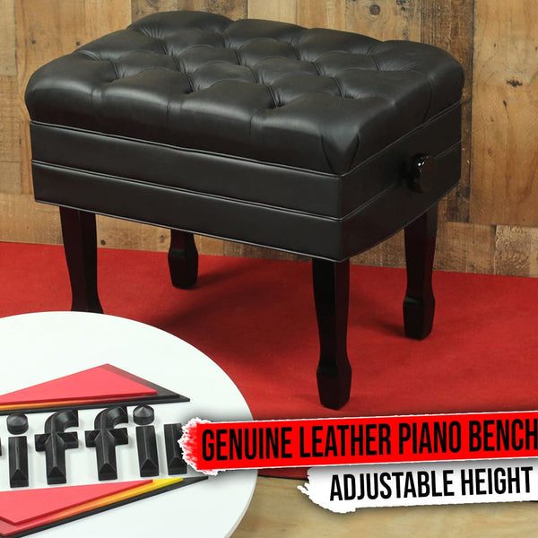 Make your piano playing look and feel like a million bucks with this sleek, adjustable padded leather piano seat with storage! Not only does this luxurious bench come with a solid wood frame and legs with black colors that coordinate with any decor, but it also has a soft, matte black leather seat and glossy black finish. It's the perfect size for adults and kids alike, with two simple hand turn knobs that can adjust the height from 20 inches up to 25 inches. Plus, it features a 3.5-inch thick cushion and 17 button deep diamond tufted design. It even has a secret storage compartment for your sheet music and books. Get ready to take your performance to the next level with this 100 percent genuine leather piano bench. Perfect for piano teachers and players of all ages!