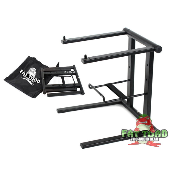 In just a few seconds, this disc jockey laptop stand / DJ table stand folds completely flat for ultimate portability with its featured spring lock pin! This sturdy and stable laptop table stand is ideal for disc jockeys but also can be used for personal use as well. The main tray easily accommodates all laptops measuring up to 18 inches wide and 14 inches deep, and the DJ laptop mounts sub tray holds small equipment up to -12 inches wide and 5.75 inches deep while the height can be adjusted from 4.5 inches to 8.75 inches. Both trays feature rubber padding to help prevent your laptop and other gear from sliding out of place. This ultra versatile laptop stand can easily accommodate a total weight load of 22 pounds, and a free carrying bag is included with every stand. DJs, karaoke jockeys, or anyone who needs to get their laptop higher than their desk will love this DJ laptop holder. Complete with an all-black finish, this strong disc jockey laptop computer mount is perfect for your next event. It makes a great gift too!