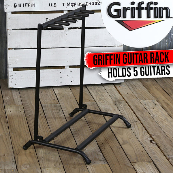 Tired of your guitars just laying around unattended? Let the Griffin Portable 5 Guitar Stand be your trusty "guitar bodyguard"! With its sturdy, road worthy, tubular steel and neoprene rubber construction, this stand can confidently secure up to 5 of your favorite guitars (acoustic, electric, bass, you name it) and keep them safe from scratches and scuffs. And when it's time to hit the road, the stand quickly folds up for easy transport. Trust the Griffin name and make sure your guitar is GIG READY!
