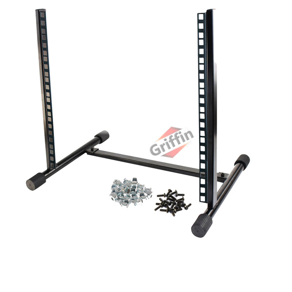 Griffin has done it again! Weighing in at only six pounds, this ten (10) space rack mount studio can hold over twenty (20) times its own weight (125 lbs). This is a great, heavy duty, 10 space studio equipment rackmount stand with a black steel tubing design, which angles slightly back to display equipment easily and conveniently. Twenty (20) standard rack screws are included; these recording studio rackmount stands accommodate standard American rack rail screw sizes. Rugged, rubber tips on the feet help keep the 10 space rack mount stand from sliding.