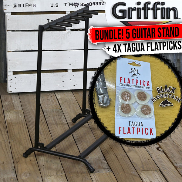 This listing bundles the Griffin Portable 5 Guitar Stand with the handcrafted Black Mountain Tagua Flatpick, giving guitarists both safe storage and a warm, natural tone boost. The Griffin stand supports acoustic, electric, and bass guitars with a sturdy tubular steel frame wrapped in soft neoprene padding to protect your finishes from accidental battle scars. It holds up to five guitars securely, great for players who keep collecting “just one more”, and folds down fast for easy travel. Built to Griffin’s tough standards, it’s reliable for gigs, rehearsals, studios, or your home corner of musical chaos. The Black Mountain Tagua Flatpick brings a rich, resonant voice thanks to its natural Tagua material, also known as vegetable ivory. Its 2.5 mm profile glides smoothly across strings on acoustic, electric, bass, mandolin, ukulele, and more. A built-in cork grip keeps the pick steady, while the polished finish helps with crisp attack, fast runs, and expressive clarity. Each handcrafted pick has its own unique look and produces the organic tone synthetic picks can’t fake. Together, this stand and pick bundle delivers solid guitar support and a warm, smooth playing experience.